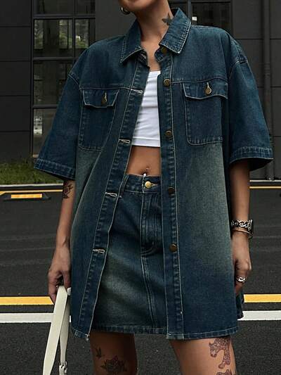 2pcs Casual Denim Shirt And Shorts Set,Fall Women Clothes-49%