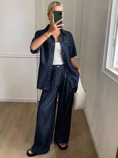 Women Casual Fashion Single-Breasted Denim Shirt And Loose Wide-Leg Jeans Set