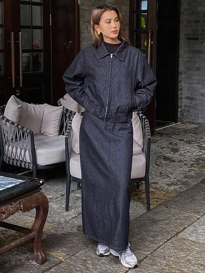Women's Denim Jacket With Collar & Waist Cinching, And Long Denim Skirt, Casual Denim Set