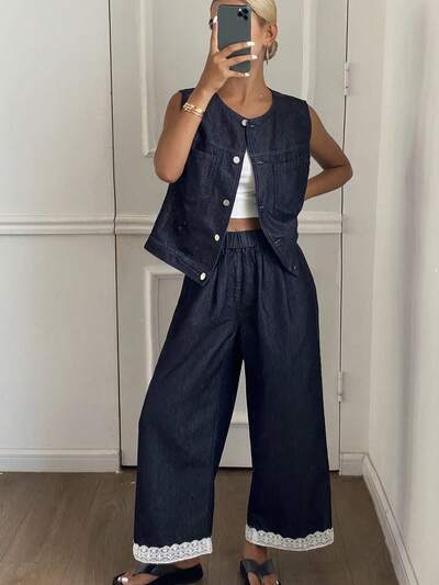 Women's Summer Sleeveless Vest And Loose Pleated Flared Hem Pants Casual 2 Pieces Denim Suit-25%