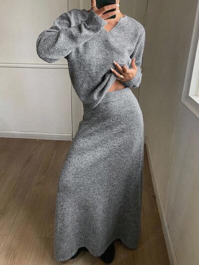 Women's Loose Business Casual Knit Sweater And Straight Skirt 2 Pieces Set, Autumn/Winter