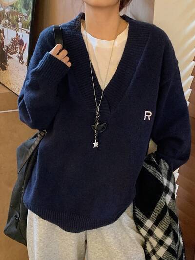 Loose V-Neck Letter Embroidery Long Sleeve Casual Street Style Sweater For Women, Autumn/Winter-71%