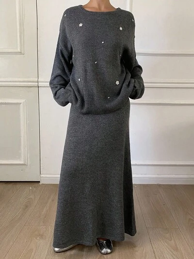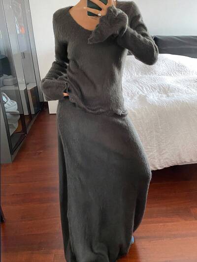 Women's Autumn Round Neck Loose Top And Long Knit Dress 2 Pieces Set-60%