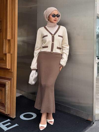 Women's Elegant Contrast Color Cardigan & Skirt 2 Pieces Set, Autumn Modest Fashion-73%