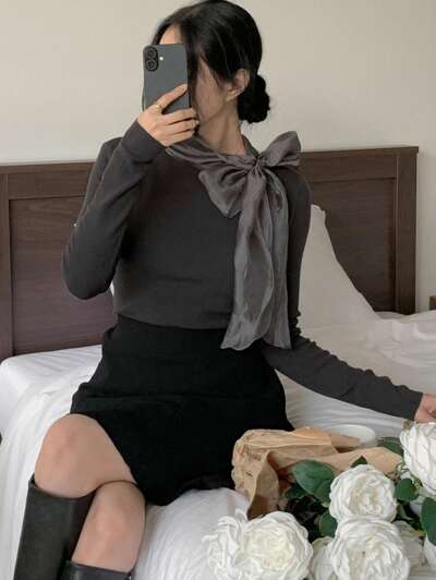 Women's Collared 2 In 1 Bow Decor Slim Fit Long Sleeve Pullover Sweater,Fall Women Clothes-35%