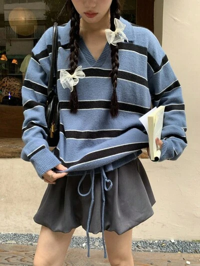Women's Collared Korean Style Striped Casual Solid Color Back To School Long Sleeve Sweater Fall-60%