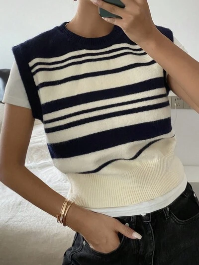 Women's 2 In 1 Tie-Waist Patchwork Short Sleeve Round Neck Short Knit Sweater, Casual & Chic