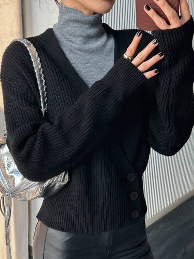 Design Sense Asymmetric Button V-Neck Knitted Pullover Sweater For Women,Fall Women Clothes-60%