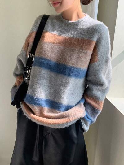 Color Block Drop Shoulder Fluffy Knit Sweater,Fall Women Clothes-60%