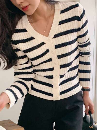 Women V-Neck Single-Breasted Casual Striped Cardigan, Autumn/Winter-60%