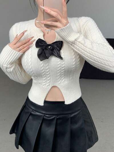Women's Bow Splice Slim Fit Long Sleeve Pullover Sweater Fall-60%