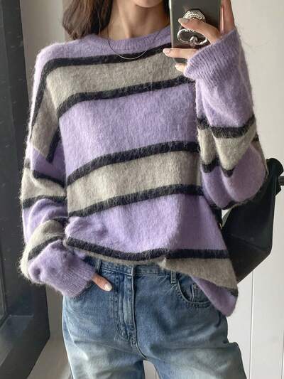 Women Autumn/Winter Round Neck Long Sleeve Single-Breasted Striped Cardigan-54%