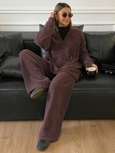 Women's Solid Color V-Neck Drop Shoulder Long Sleeve Sweater And Knit Pants Casual 2-Piece Set, Autumn/Winter-72%