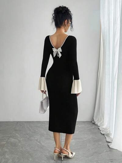 Elegant Contrast Color Bow Knitted Dress For Women, Autumn Sweater Dress-35%
