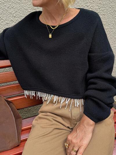Women's Casual Long Sleeve Loose Cropped Fringe Sweater-73%