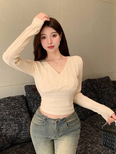 Loose Fit Round Neck Long Sleeve Knit Blouse For Women