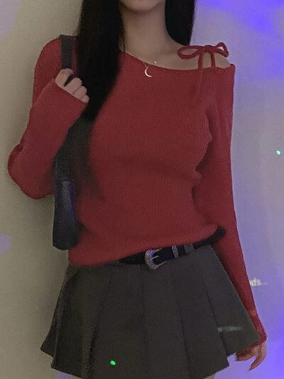 Women's Solid Color Off-Shoulder Tie-Neck Long Sleeve Casual Sweater Fall-60%