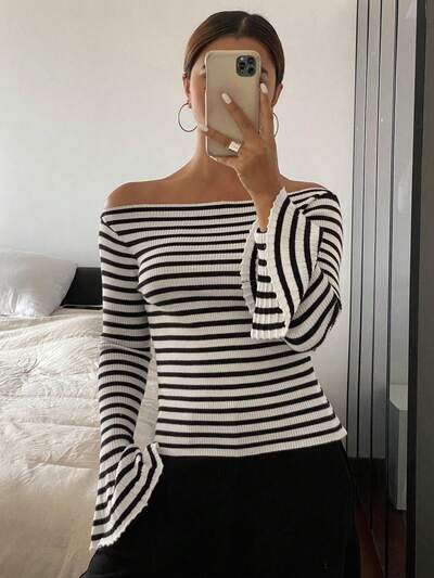Striped Open Shoulder Knit Blouse,Fall Clothes Women Sweater Off Shoulder Top-60%