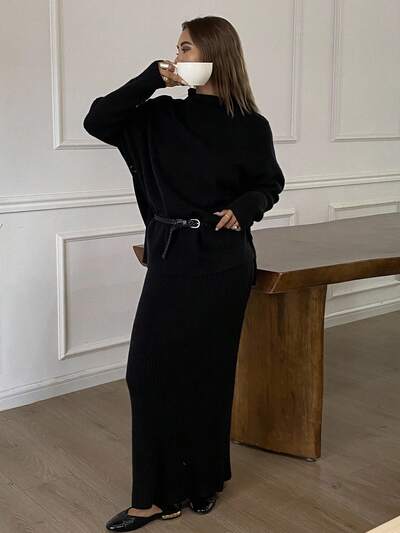 Women's Elegant Black Knitted 2 Pieces Set, Autumn/Winter Fall-60%