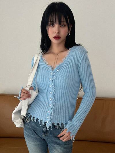 Solid Distressed Trim Button Front Cardigan,Fall Clothes-60%