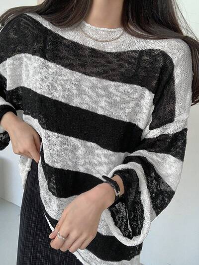 Women's Loose Fit Black And White Striped Sweater Fall-60%