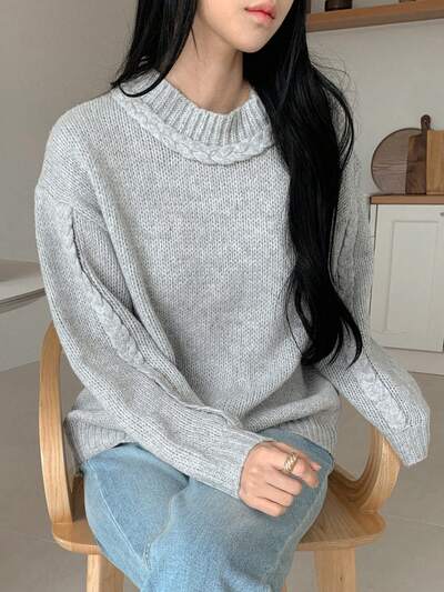 Women's Solid Color Loose Fit Crew Neck Long Sleeve Cable Knit Sweater,Fall Women Clothes-60%
