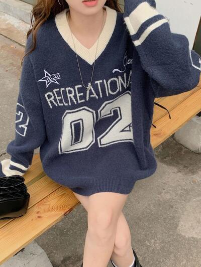 Women's Solid Color Letter Embroidery High Neck Long Sleeve Loose Knitted Sweater,Long Sleeve Tops,Fall Women Clothes-73%