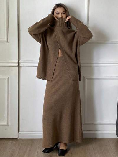 Women's Solid Color Loose Slit High Neck Long Sleeve Sweater & A-Line Skirt Casual Two Pieces Set, Autumn/Winter-51%