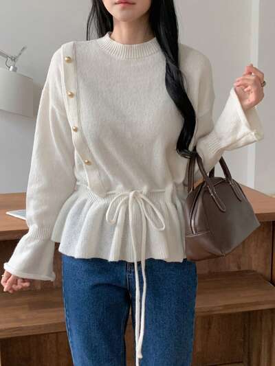 Women's Solid Color Drop Shoulder Flare Sleeve Drawstring Waist Casual Sweater, Autumn/Winter-55%