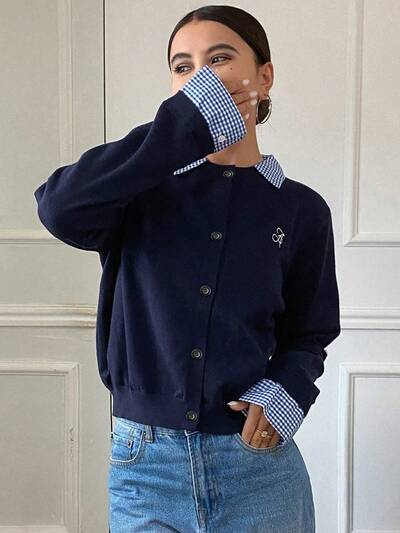 Women's Casual Patchwork Plaid 2 In 1 Letter Embroidery Long Sleeve Cardigan-48%
