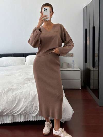 Women's Solid V-Neck Drop Shoulder Long Sleeve Sweater And Knit Midi Skirt 2 Pieces Casual Set, Autumn/Winter-35%