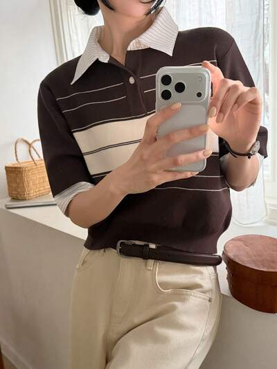 Women's Collared Contrast Color Casual Knit Sweater, Korean Style Summer-60%