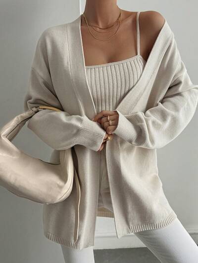 2pcs Women Casual Solid Color Camisole Cardigan Sweater Set, Autumn-36%