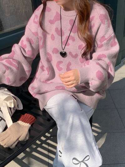 Women's Colorblock Striped Floral Print Loose Fit Long Sleeve Crew Neck Elegant Knit Sweater, Autumn/Winter