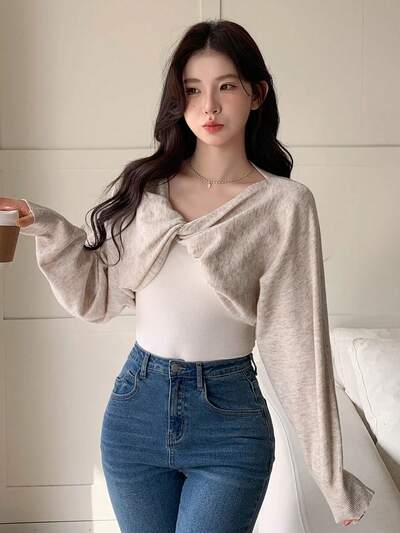 Women's Twisted Knit Batwing Sleeve Cropped Sweater,Fall Clothes-42%