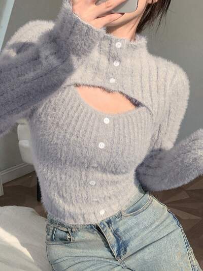 Solid Button Front Cut Out Front Fluffy Knit Sweater,Long Sleeve Tops,Fall Women Clothes-35%