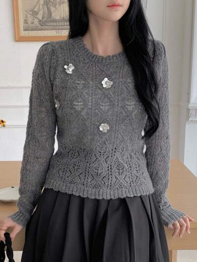 Women's Round Neck Beaded Hollow Out Cable Knit Long Sleeve Pullover Sweater, Casual & Elegant Fall-39%