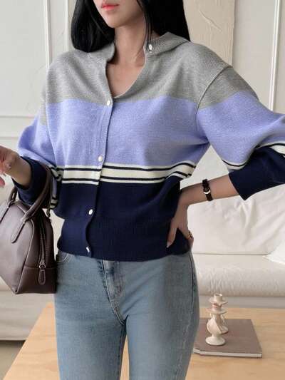 French V-Neck Contrast Color Knit Cardigan, Women Long Sleeve Loose Casual Sweater Jacket-35%