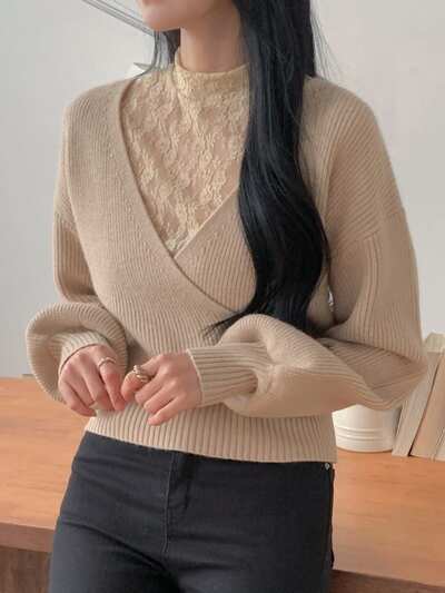 Women's Autumn/Winter Contrast Lace Drop Shoulder Long Sleeve Elegant Sweater-53%