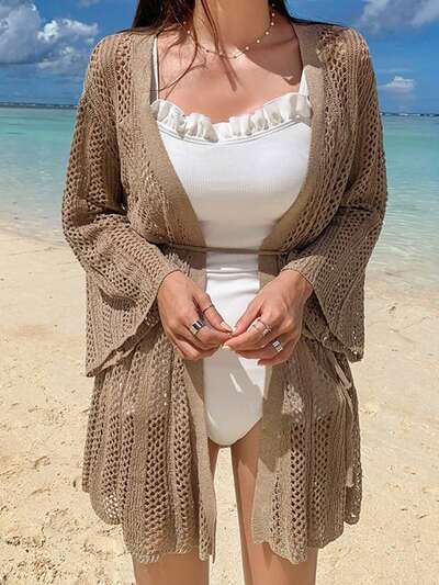 Women's Vacation Solid Color Drop Shoulder Long Sleeve Hollow Out Thin Cardigan-60%