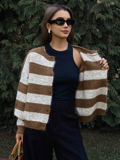 Contrast Stripe Loose Crew Neck Long Sleeve Cardigan With Horn Buttons, Casual Street Style For Women, Autumn/Winter-35%