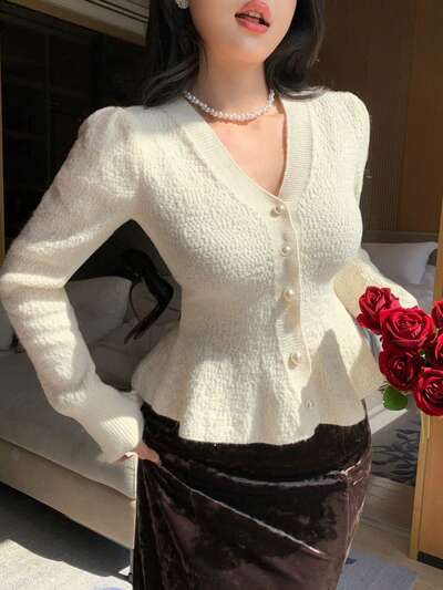 Short Sweater For Women, V-Neck Puff Sleeve Ruffled Hem Cropped Cardigan, Autumn/Winter-35%