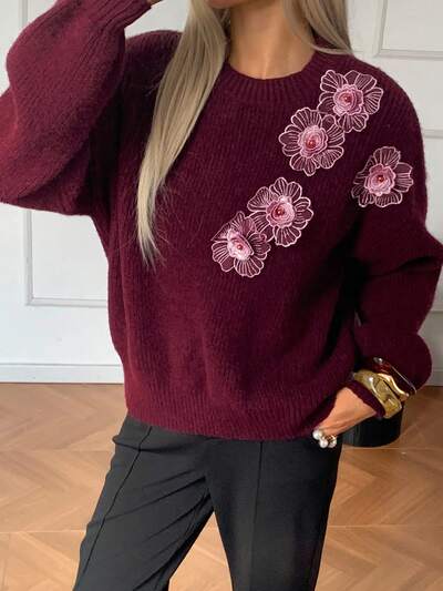 Women's Autumn Round Neck Waist Cinched Feather Trim Sweater Dress