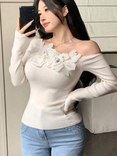 Women's Elegant Oblique Shoulder Floral Decor Sweater, Autumn Off Shoulder Top-60%