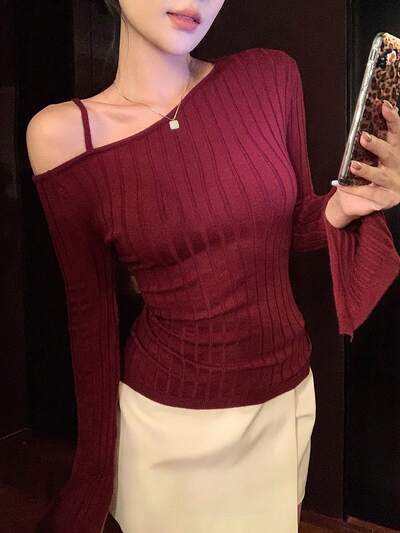 Women's Fitted Oblique Shoulder Long Sleeve Exposed Shoulder Sweater Fall-60%