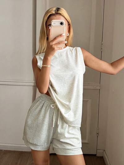 Women's Solid Color Round Neck Camisole And Drawstring Waist Shorts Casual Pajama Set-18%