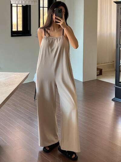 Minimalist Solid Color Wide Leg Contrast Strap Women Jumpsuit Pajamas-62%