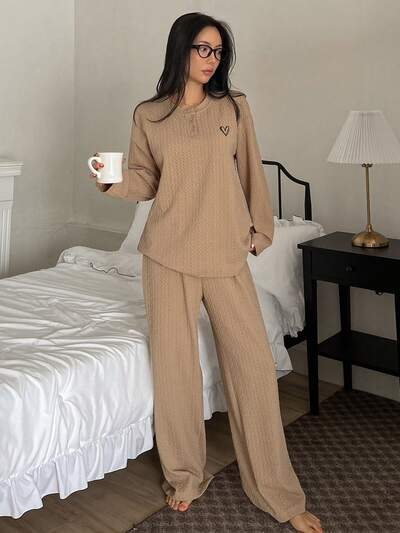 Women Letter & Heart Embroidery Textured Drop Shoulder Loose Pajamas Set-60%