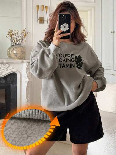 2pcs Women Casual Graphic Print Loose Fit Long Sleeve Top And Shorts Pajama Set, Cozy Outfit Fall Winter Clothes-64%