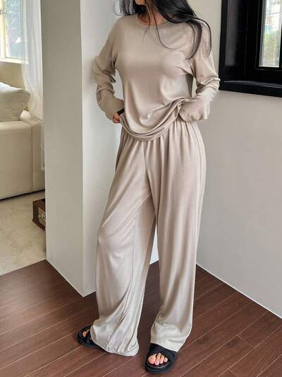 Women's Solid Color Round Neck Drop Shoulder Top And Pants Casual Lounge Suit, Cozy Outfits, Fall Winter Clothes Pajama-39%